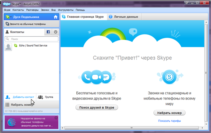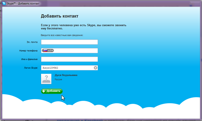 Далее в открывшемся окне вводим логин нужного абонента и нажимаем кнопку "Добавить", он автоматически будет добавлен в ваш список контактов!