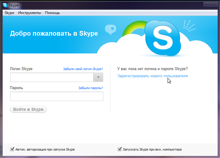 По завершению установки запускаем скайп. В открывшемся окне выбираем "Зарегистрировать нового пользователя".