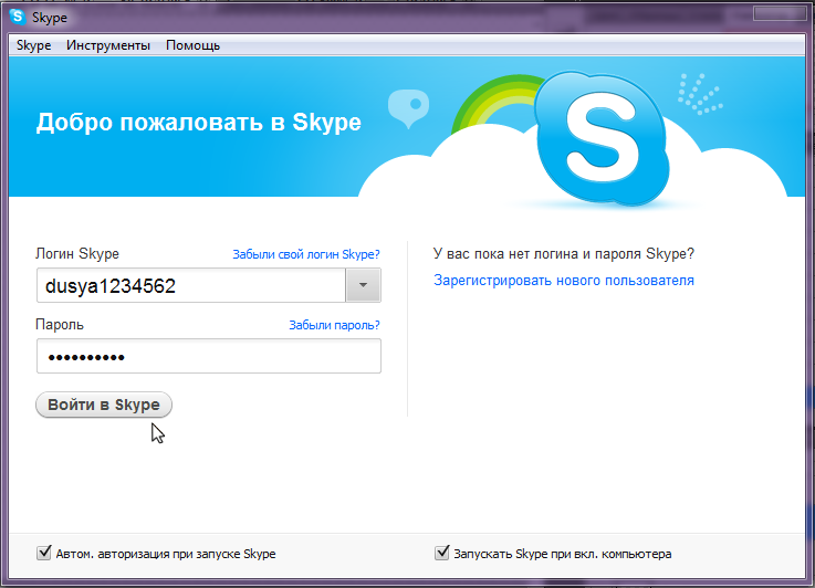 После завершения регистрации в окне самой программы введите свои логин и пароль и нажмите " Войти в скайп".